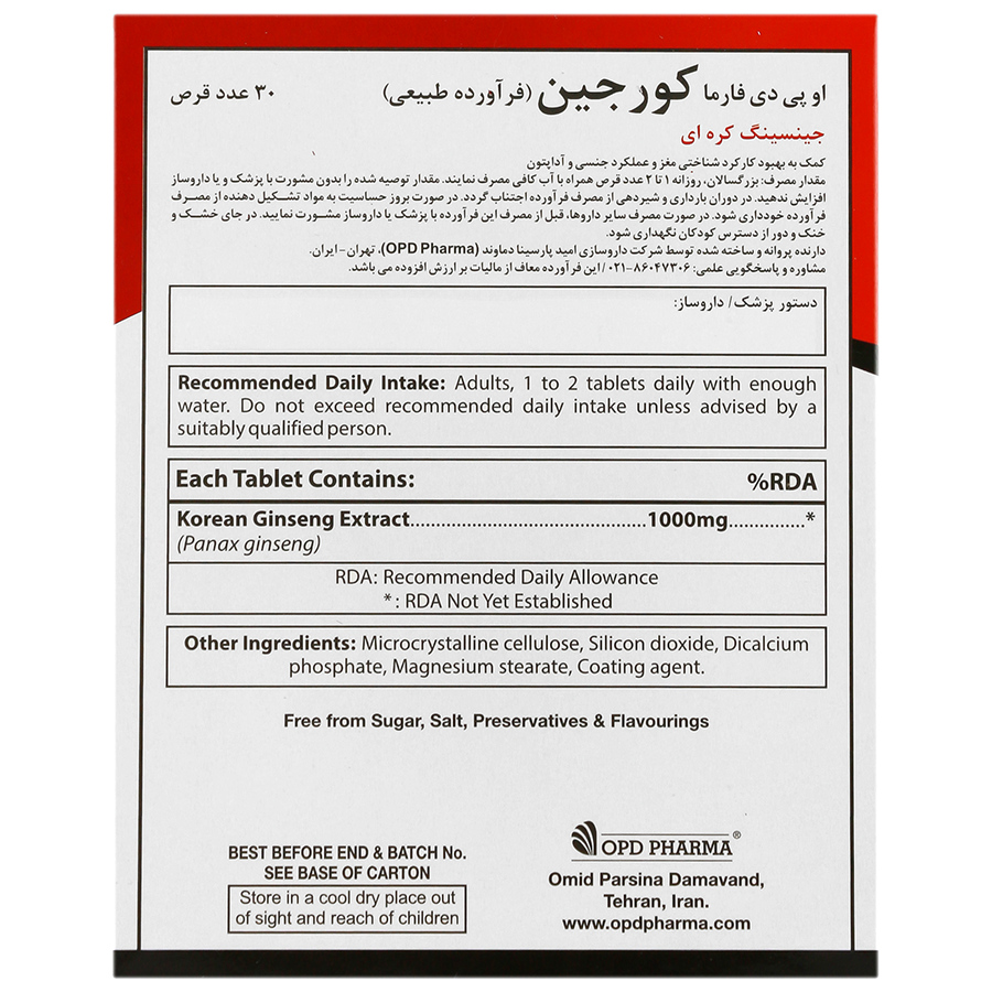 - قرص کورجین او پی دی فارما با ۱۰۰۰ میلیگرم عصاره جینسینگ کرهای، به افزایش انرژی، تمرکز، کاهش استرس و بهبود عملکرد جسمی و ذهنی کمک میکند.